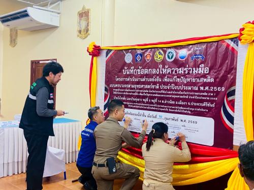 นางวาสนา บุญจันทรานุรักษ์ พัฒนาการอำเภอเมืองประจวบคีรีขันธ์ พร้อมเจ้าหน้าที่พัฒนาชุมชน นายสัญญา รัศมี ผู้ใหญ่บ้าน หมู่ 8 นางสาวสายไหม เปรมประสิทธิ์ ผู้ใหญ่บ้าน หมู่ 14 นายสฤษดิ์ ใจใหญ่ กำนันตำบลอ่าวน้อย ว่าที่ พ.ต.อ.ชาญยุทธ พวงสั้น ผกก.สภ. อ่าวน้อย นายเมธาศักดิ์เกิด ปลัด อบต.อ่าวน้อย ปฏิบัติหน้าที่ นายก อบต.อ่าวน้อย นายพลสิต เวที สาธารณสุขอำเภอเมืองประจวบคีรีขันธ์ และนายอนุรักษ์ มาลาลักษมี ผอ.รพ.สต.บ้านย่านซื่อ ร่วมพิธีลงนามบันทึกข้อตกลงให้ความร่วมมือโครงการดำเนินงานตำบลยั่งยืนเพื่อแก้ไขปัญหายาเสพติดแบบครบวงจร ตามยุทธศาสตร์ชาติ ประจำปีงบประมาณ พ.ศ.2569 ตามศูนย์อำนวยการป้องกันและปราบปรามยาเสพติด จังหวัดประจวบคีรีขันธ์และสำนักงานป้องกันปราบปรามยาเสพติด ภาค 7 ณ บ้านวังไทรติ่ง หมู่ 8 และบ้านทุ่งยาว หมู่ 14 ตำบลอ่าวน้อย อำเภอเมือง จังหวัดประจวบคีรีขันธ์ ณ ห้องประชุมสถาบันการเงินตำบลอ่าวน้อย